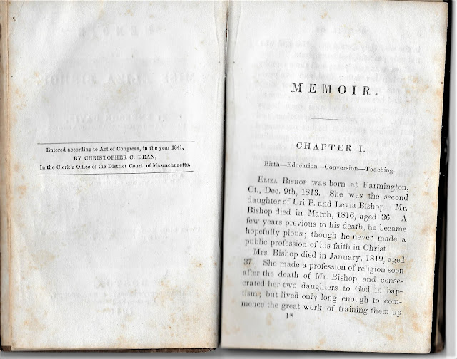 The small book, Memoir of Miss Eliza Bishop (listed in WorldCat.org) was published after her death. I grabbed the little leather bound book after my grandfather's death, and was always interested in this young woman. Not until I got into genealogy did I try to place her in the family, visited her grave and donated my book (see photo) to the Westfield Library, in Westfield, Massachusetts. Her parents and other family members are buried in Connecticut, see I Did Everything Right, but Couldn't Take a Photo!